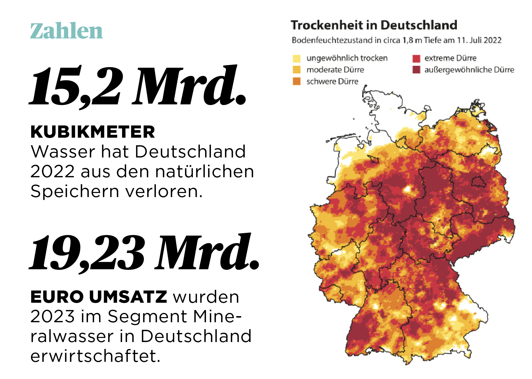 Auch Deutschland ist von der Trockenheit erheblich betroffen. Der Dürremonitor des Helmholtz-Zentrums für Umweltforschung weist für große Teile von Nord- und Ostdeutschland sowie Bayern und Baden-Württemberg eine „außergewöhnliche Dürre“ aus. Der Hydrologe Dietmar Mehl analysiert, dass „große Teile Brandenburgs, auch Teile von Sachsen-Anhalt, Thüringen, Mecklenburg-Vorpommern und von Sachsen heute unter extremen Bedingungen leiden: Sie haben ein Minus in der klimatischen Wasserbilanz, sind streng genommen eigentlich aride Gebiete.“