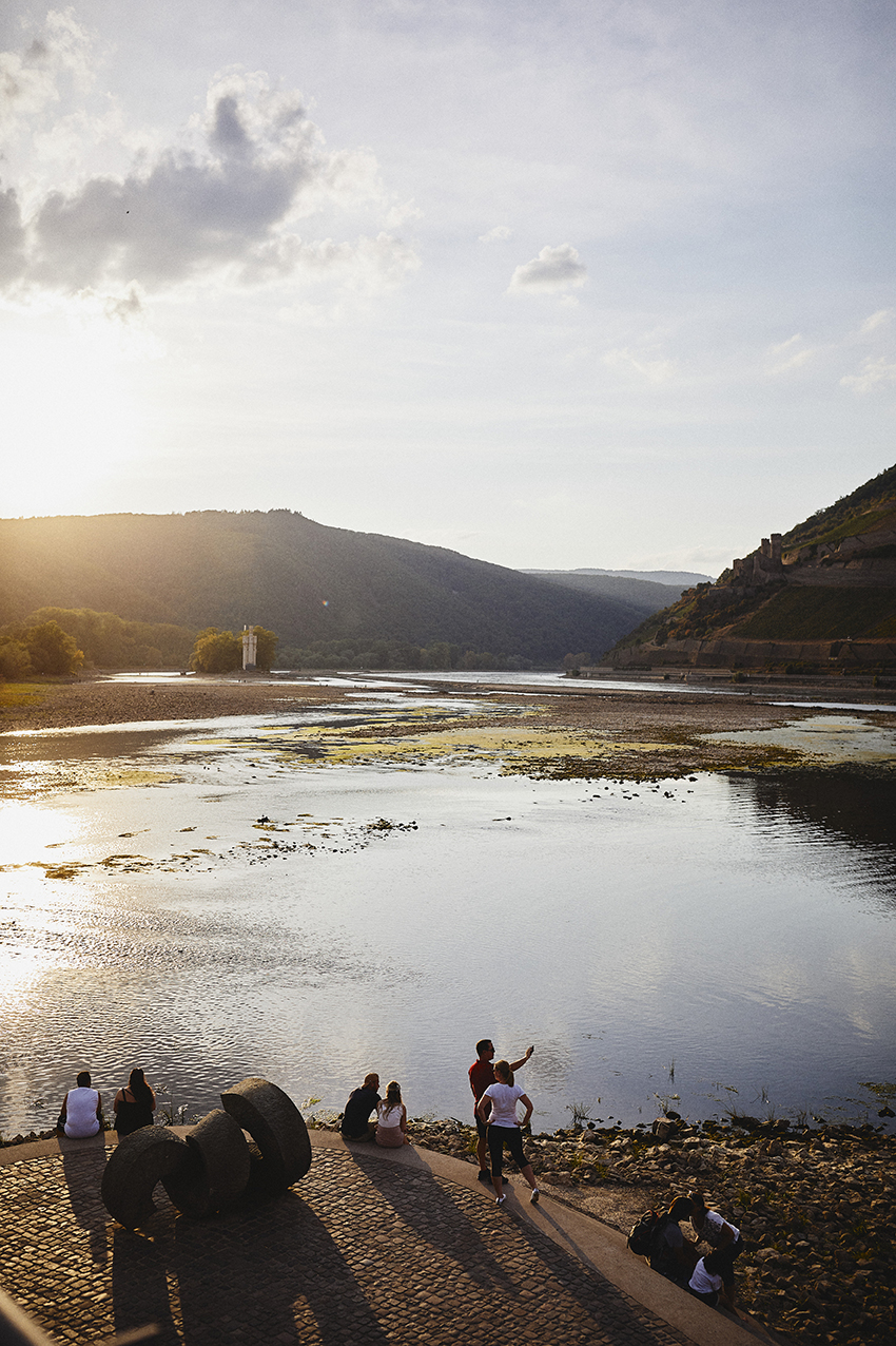 Attraktion oder bald Alltag? Niedrigwasser im Rhein bei Bingen.